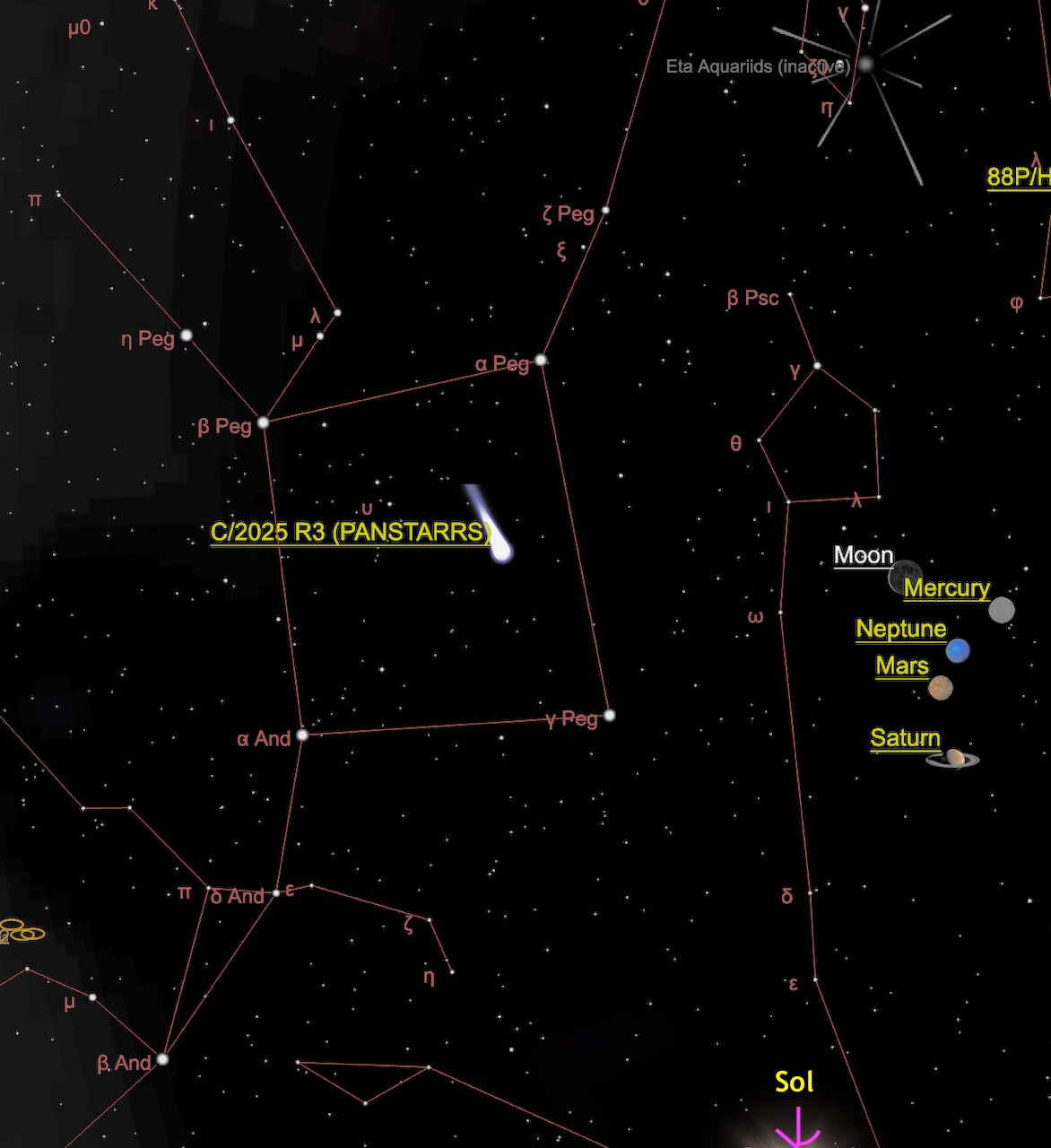 En los últimos días se han recibido reportes y fotografías del cometa C/2025 R3 desde otros países en el hemisferio norte y ahora también se ha captado en Costa Rica. Este cometa ha ido creciendo en brillo y ya tiene una magnitud visible a simple vista. De momento está al amanecer en nuestro país, ubicado en el corazón de Pegaso, el caballo alado.
