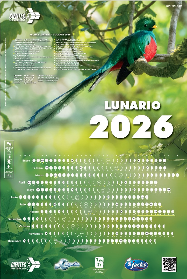 El programa de astronomía fomenta la observación del ambiente, el aprendizaje de ciclos, el seguimiento de fenómenos celestes y el aprendizaje cultural y su relación con astros. Entre los materiales editados anualmente se encuentra el Lunario para Costa Rica, que en el 2026 llega en su edición 33 y está dedicado al Quezal, este ave tan especial de nuestras regiones montañosas. El Lunario es un almanaque de datos astronómicos y culturales diseñado para Costa Rica y la región (UTC-6h). El código QR del Lunario 2026 de CIENTEC está asociado a este recurso informativo para ampliar la información en el calendario.