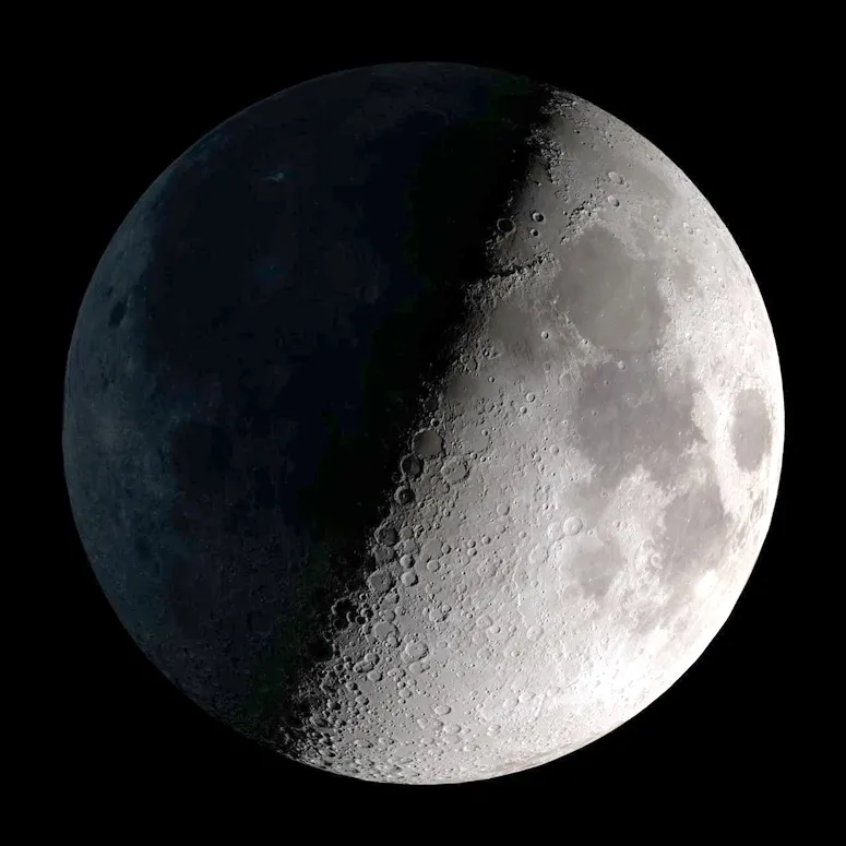 Pruebe ver la línea recta entre la región iluminada y la oscura de su superficie. Solo la mitad se ver iluminada desde la Tierra y seguirá creciendo hasta llegar a Luna llena. En el hemisferio norte podría representar la letra "D". En la superficie iluminada se encuentran la cabeza y las orejas del "conejo mítico".
