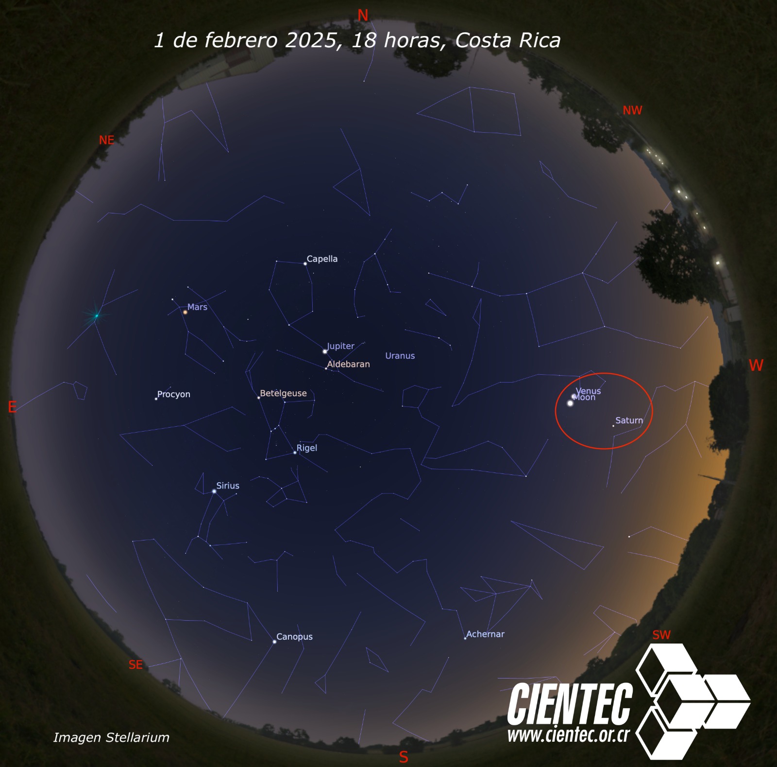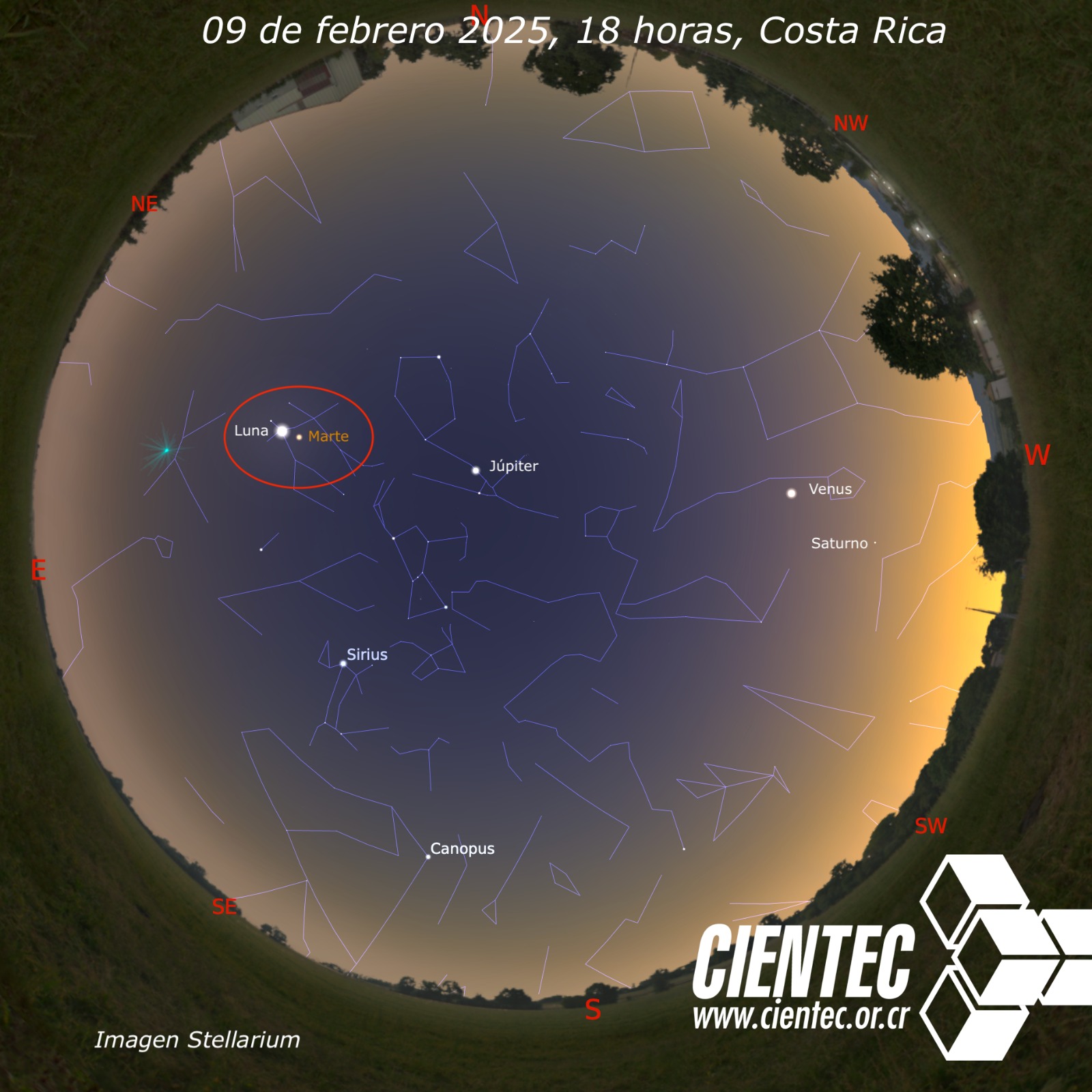 La Luna y el planeta Júpiter alcanzan su mayor cercanía a las 20:01 (hora de CR) y pasan 5°25' uno del otro. La Luna y Júpiter están en Tauro y la Luna está de 9 días.