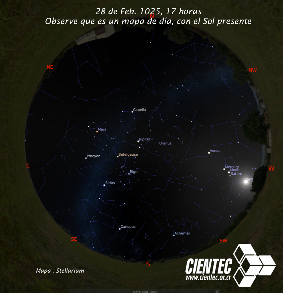 El par de astros será visible alrededor de las 17:54 hora de CR, a unos 39° sobre el horizonte oeste en la destello del atardecer. Como siguen al Sol, estarán ocultándose por el oeste unas 2 horas t 58 minutos después del Sol, a las 20:39.