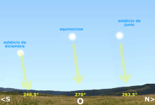 En los dos equinoccios, el Sol sale por el Este y se pone por el Oeste, pero no pasa por cenit. En el solsticio de diciembre, el Sol sale unos 23,5° hacia el Sur del Este. En el solsticio de junio, el Sol sale como unos 23,5° hacia el Norte del Este.