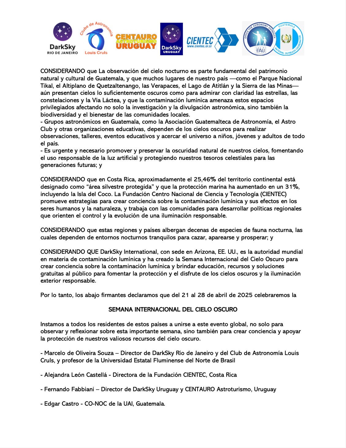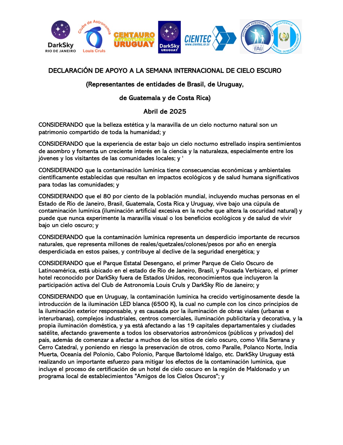 - Organizaciones de Brasil, Uruguay, Guatemala y Costa Rica declaran su apoyo a la conservación de los cielos oscuros.
