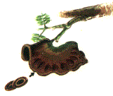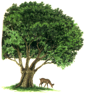 Copa muy amplia (10 m de diámetro). Puede alcanzar 30 m de altura. Tronco grueso de hasta 2.5 m de diámetro, corteza de color gris claro y lisa. Los frutos sirven de alimento al ganado y otros animales. |