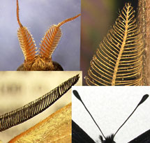 Diferentes tipos de antenas de mariposas. Fotografía inferior derecha:antenas de una mariposa diurna. Tres imágenes restantes mariposas nocturnas.