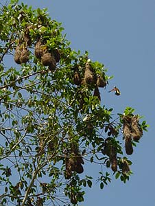 Arbol cargado de nidos de Oropéndola en la región atlántica.Luego se inicia la construcción del nido, con la participación de ambos sexos en la mayoría de los casos, o solo de la hembra, como ocurre en colibríes y saltarines. Una vez cumplida esta fase, se incuban los huevos y se crían los pollos.