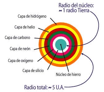 En las fases finales de una estrella masiva (mayor a 10 veces la masa del Sol), el sistema se vuelve inestable. El gran núcleo de hierro se contrae repentinamente, las capas externas desgastadas se precipitan también hacia adentro. Cuando el colapso del núcleo se detiene y se genera una tremenda onda de choque, que encuentra a su paso el material de las capas exteriores, explota y se forma una supernova.