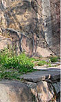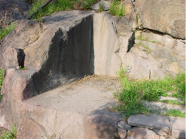 El corte en la roca, en un borde del aposento, produce diferentes efectos de sombra de acuerdo al desplazamiento del sol. Aquí se puede observar la exactitud de la orientación y la sombra producida el día del equinoccio, que cubre únicamente la cara lateral. |