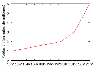 | Si uno observa una curva que representa el crecimiento de la población mundial en función del tiempo, se nota ya a mediados del siglo 19 un fuerte aumento, indicando un crecimiento importante en la población. Esta tendencia sigue y resulta en el número alrededor de 6 mil millones de personas para el inicio del siglo 21. |