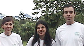 | Alejandra León, Laura Calderón y Ronald Arias de CIENTEC, con el volcán Arenal al fondo. |
