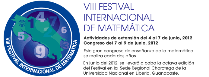 El VIII Festival Internacional de Matemática, se realizará del 7 al 9 de junio, 2012, en la Sede Chorotega, de la Universidad Nacional en Liberia, Guanacaste, actividades de extensión previas (4 al 7) en diferentes regiones del país.