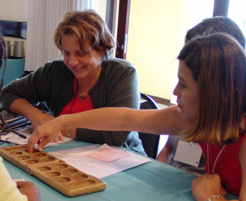 Los jugadores se colocan uno frente al otro con el tablero en medio y los Kalahs en los extremos derecho e izquierdo.