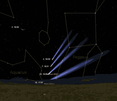 Gráfico de la posición del cometa C/2002v1 (NEAT) del 4 al 13 de febrero. El cometa se encuentra al anochecer al oeste, a la izquierda de la constelación de Pegaso, cada día más cerca del Sol. Los datos están dados para Costa Rica de la siguiente manera: fecha en febrero, hora:minutos.