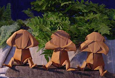 Monos - "que no escuchan, no hablan y no ven ... la maldad." Elaborados en la técnica "origami en húmedo" por Eric Madrigal, presidente de la Asociación Costarricense de Origami, siguiendo el modelo de Hiroo Kamo. La asociación estará presente en el Parque Okayama el 6 de febrero con CIENTEC, en el cierre de la celebración del Año Nuevo Chino, con la Oda a la Luna. |