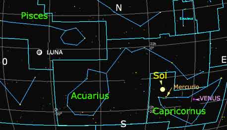 Ese día el cachito de Luna estará en Pisces, al oeste pero cerca del Sol. El Sol se encuentra en un extremo de Capricornus, lo cual significa que no se podrá ver esta constelación ni las regiones vecinas en Acuarius, que también estarán inmersas en su luz.Esa noche ...