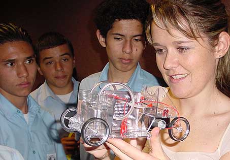 Una de las presentaciones en Costa Rica, se realizó en formato de espectáculo dirigido a estudiantes de colegios científicos, invitados por el CENAT. Como innovación, la Dra. Bultitude dio opciones de temas y les permitió *diseñar* su presentación. Los estudiantes votaron dos veces, escogiendo entre dos opciones. Ella venía con todos los temas y las demostraciones preparadas, pero su experiencia con jóvenes en Europa indica que ellos quieren tomar decisiones y que aprovechan mejor de esta manera. BATERIAS DE HIDROGENO