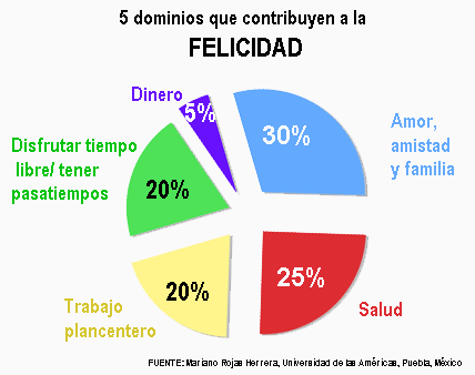 Contrariamente a lo que la gente cree -y también a lo que argumentan muchos economistas y funcionarios de organismos internacionales-, el dinero vale muy poco. En realidad, supone apenas entre un 5% y un 7% de la felicidad. Según los estudios desarrollados por el economista costarricense y profesor de la Universidad de las Américas, en Puebla (México), Mariano Rojas Herrera y sus colegas, los seres humanos vivimos en 5 grandes áreas. Se llaman ?dominios de vida?, y el dinero es el menos importante.