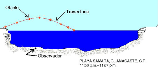 "...la noche del 31/12/2006 a eso de las 11:50 p.m. a las 11:57 p.m. aproximadamente, tuve la oportunidad de ver claramente una luz color rojizo-naranja desde Playa Sámara en la Península de Nicoya. Llevaba un movimiento cuya trayectoria formaba un arco a unos 20º sobre nuestro horizonte. Mi primera impresión fue que era parte de la pólvora en la celebración del fin de año, sin embargo al elevarse sobre el horizonte observe curiosamente su trayectoria hasta ocultarse nuevamente bajo la curvatura terrestre. ... ni la ISS ni el Hubble estaban para esa hora y lugar en una trayectoria acorde a mi avistamiento, por tanto, quedé más intrigado.