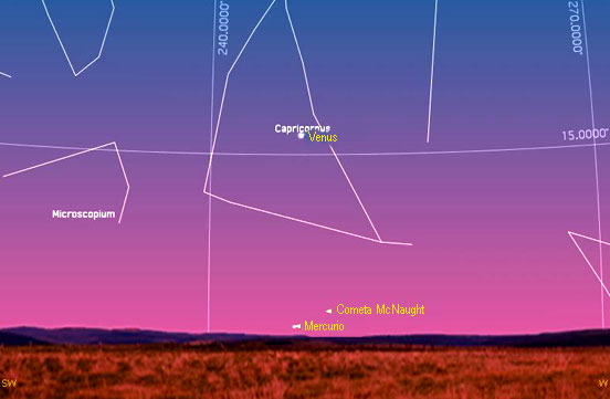 Venus se encuentra a 16° , el Cometa McNaught C/2006 P1 a 3° y Mercurio a 2° sobre el horizonte.Véalo a través de SOHO, los días 12-15 de enero, cuando el cometa recorra el campo de un coronógrafo, el LASCO C3, que se actualiza constantemente.