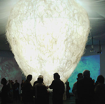Una megaestructura es la pieza central de esta instalación. Fue elaborada con redes de pesca ilegal, decomisadas por embarcaciones de MarViva y guardacostas de la Isla del Coco. Su forma de capullo también es simbólica de la estrategia del cardumen al encontrar depredadores: los pequeños peces se aproximan y nadan juntos para parecer un pez inmenso. ![]()