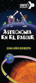 HORARIO: de 6 a 9 PM SITIO: Parque Lineal del Río Torres, Polideportivo Aranjuez, Distrito del Carmen, San José, Costa Rica. DIRECCION: del Colegio México, junto al Puente de los Incurables, 150 m. al oeste, Bo. Aranjuez, San José. TEMAS: Los temas principales del período son: 2008 año bisiesto, el Eclipse Total de Luna en febrero y la celebración del Año Internacional del Planeta Tierra (IYPE por sus siglas en inglés). De acuerdo a la tradición, las sesiones incluyen un conferencia y dos horas de observación guiada, con acceso a instrumentos ópticos. Durante la conferencia, habrán sillas para los primeros cien asistentes en llegar. Los asistentes reciben materiales impresos y participan en una rifa de productos. ORGANIZAN: Municipalidad de San José, la Asociación pro Polideportivo Aranjuez y CIENTEC. |