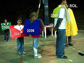 Dinámica para explicar el bisiesto. Participan los asistentes al programa de realizado en el Parque Lineal del Río Torres, Polideportivo Aranjuez. Enero, 2008. |