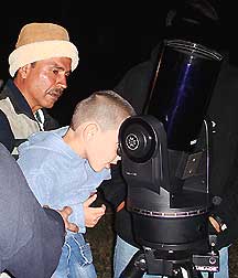 Padre e hijo en el Polideportivo de Aranjuez observando a través del telescopio.Siguiente presentación en el cantón de San José: GIRA OBSERVACIÓN ECLIPSE TOTAL DE LUNA
