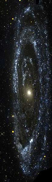 * Esta imagen fue generada por el Galaxy Evolution Explorer de la gran galaxia de Andrómeda, Messier 31. La galaxia es la segunda más masiva de nuestro grupo local de galaxias, que incluye a la Vía Láctea. Andrómeda es la galaxia grande más cercana a la nuestra. La imagen original, un mosaico del que se cortó este extracto, fue construido con 10 imágenes diferentes tomadas por el Galaxy Evolution Explorer en setiembre del 2003. La imagen de color (con la cercana a ultravioleta en rojo y la lejana ultravioleta en azul) muestra regiones azules donde existen estrellas jóvenes, calientes, de gran masa, que se muestran en los brazos espirales donde la formación de nuevas estrellas está ocurriendo y en bulto central, de color anaranjado, que está compuesto por estrellas viejas, menos calientes, que se formaron hace mucho tiempo.
