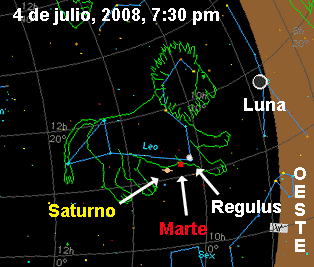 horizonte oeste. Saturno amarillento, Marte claramente rojizo y Régulus