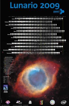 Calendario de fases lunares e información astronómica. La maravillosa Nebulosa de la Hélice es la fotografía de fondo del Lunario 2009. Foto: NASA, ESA, C.R. O?Dell (Vanderbilt University), M. Meixner and P. McCullough (STScI) Conozca más sobre esta nebulosa en esta animación en el sitio web del Hubble Tour de la Nebulosa.