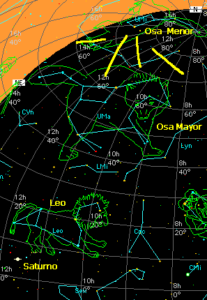 Activas: 17 ? 26 Diciembre Máximo: Diciembre 22, 07h30m UT (01:30AM para Costa Rica- TU-6h) ZHR = 10 (ocasionalmente variable hasta unos 50) Objeto madre: Cometa 8P/Tuttle ¿DONDE MIRAR EN EL CIELO? Las Úrsidas parecen salir de la Osa Menor, no muy lejos de la Estrella Polaris, la que coincide con el Norte celeste. Para Costa Rica, la Osa Menor y Polaris son difíciles de ver, porque se encuentran apenas a 10° sobre el horizonte norte. Edificaciones o montañas cercanas pueden taparlas fácilmente, al igual que nubes bajas. Pero para todos aquellos que estén a la intemperie en horas de la madrugada, la recomendación es que busquen al norte, esos trazos rápidos de las estrellas fugaces, que parecen salir cerca de la muy reconocida Osa Mayor. También habrán otras joyas que observar a esas horas, tales como la constelación de Leo y en su base, el brillante planeta Saturno. |