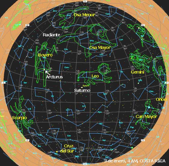 Según Robert Lundsford y otras fuentes de NAMN (North American Meteor Network) e IMO (International Meteor Organization), la esperada lluvia de Cuadrántidas tendrá su pico esta noche, 2 y 3 de enero, con el máximo esperado entre las 13 y las 17 horas TU del 3 de enero.Para Costa Rica y la zona horaria TU-6h, el máximo sería entre las 7 am y las 11 am del 3 de enero, por tanto las últimas horas de la madrugada, antes de la penumbra matutina que precede al Sol, serán las mejores para observar. La Luna, cerca del cuarto menguante, se pone como a a las 22:30. Luego sigue un cielo oscuro, libre de interferencia lunar.