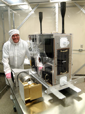 El prof. Matthews con el telescopio espacial MOST (sobre la mesa, a la izquierda; el satélite a la derecha) Foto: Canadian Space Agency (2003) |