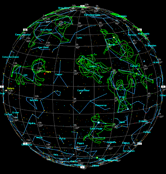 El planisferio muestra las constelaciones en la madrugada del 14 de enero, 2009.Menú