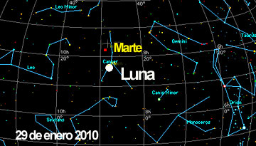 - Las estrellas de fondo son en este momento, las de la antigua constelación de Cáncer, el cangrejo, de estrellas débiles. Solo desde lugares oscuros puede dibujarse con imaginación una suerte de 'Y', como referencia.