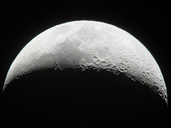 Si la noche está despejada, podremos observar la Luna en detalle. Con cinco días, se puede ver el Mar de las Crisis y el Mar de la Fecundidad (las dos orejas del conejo) a simple vista. Con binoculares se pueden encontrar algunos cráteres prominentes, como el trío de Theophilus, Sirillus y Catharina. El terminador, la línea que separa la parte iluminada de la oscura, caerá sobre el Mar de la Tranquilidad (la cabeza del conejo) y el resto de este valle se puede adivinar con la iluminación que rebota en la Tierra e ilumina levemente la región oscura del satélite (Earthshine en inglés, Luz cenicienta en español).