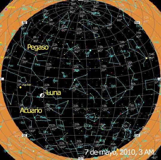 La hora pronosticada para el máximo caerá de día para Costa Rica, a las 11 am, por lo que se recomienda observar la noche de hoy, hasta el amanecer del 7 de mayo. La Luna en cuarto menguante saldrá cerca de la 1 de la mañana (7 mayo) y estará localizada muy cerca de la radiante, en la constelación de Acuario. Por ello, se recomienda evitar la Luna (póngala a sus espaldas o cúbrala con un edificio o árbol) y observar en otra dirección. Los meteoros se verán en todo el cielo. Aproveche para observar Júpiter también, que estará hacia el este de Acuario y la Luna, en la constelación de Pisces. RECOMENDACIONES PARA OBSERVAR