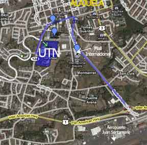 La UTN queda detrás del Mall Internacional de Alajuela, o sea, siguiendo recto al oeste unos 600 m. (Pero como no se puede por el aire, sigue otra dirección.)