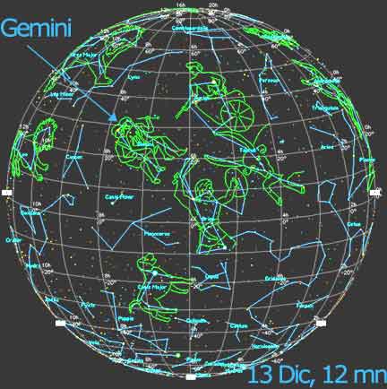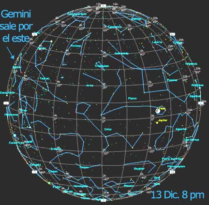 A esa hora irá saliendo la constelación de Gémini por el este y desde entonces serán visibles los meteoros, que parecerán salir de esta constelación, para irradiarse en todas direcciones. A esa hora la Luna en Cuarto Creciente estará muy cerca del planeta Júpiter, que lucirá brillante a su lado, ambos con la constelación de Pisces de fondo.