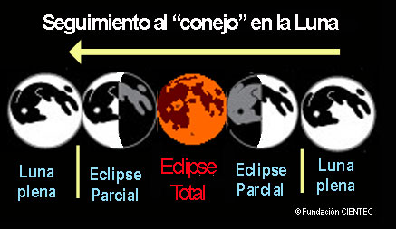 Algunos relatos y mitos antiguos (chinos y mesoamericanos) hablan de un conejo que saltó a la Luna, figura que sirve para identificar las formas oscuras que se ven en la Luna llamadas Mares. En este eclipse, le invitamos a utilizar este patrón para seguir el movimiento de la Luna conforme se sumerge y emerge de la umbra terrestre. De hecho, se proyecta que el *rabito blanco del conejo*, el cráter Copernico se meterá en la sombra a las 01:01 am.