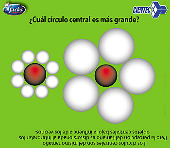 Aquí hay un buen reto para resolver. ¿Cuál círculo central es el más grande? El cerebro interpreta el tamaño y la posición de los objetos en contexto, contra el fondo, tomando en cuenta tamaños de vecinos y ángulos en el entorno. Por ello se puede confundir, o puede buscar miradas diferentes que ofrecen otras interpretaciones La percepción es un ámbito de estudio de la ciencia. |