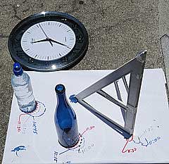 Llegó el momento esperado, las 11:36. . . las 11:37 y no estamos seguros. La botella azul parecía no tener sombra del todo, pero la botella con agua parecía tener una uñita de sombra. Tendremos que comparar con los resultados de hoy. Envíenos sus fotos. Publicaremos las más creativas.