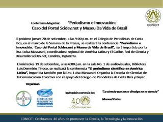 - 20 Set. 9 am "Periodismo e Innovación: Caso del portal SciDev.Net y Museu da Vida", Colegio de Periodistas de Costa Rica, Sabana este.