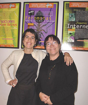 María Alejandra Villarzu, nueva directora del programa Explora-Conicyt junto a Marianela Velasco, impulsora de las campañas de valoración de la ciencia y la tecnología en el METRO. Al fondo algunos de los carteles de este programa.