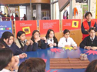 Es de mañana, un día entre semana de otoño, en el hemisferio sur. En una de las salas para talleres y demostraciones, unos veinte jóvenes escolares toman parte en este taller de chocolate. El atractivo olor se escapa e invade también salas de exposición aledañas.![]()