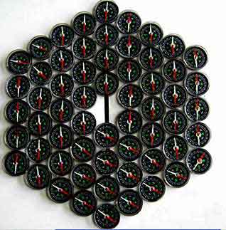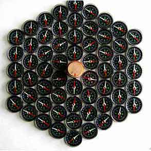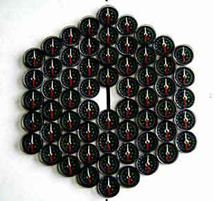Fig 3.- Brújulas interactuando como los dominios en un imán. Estas preguntas, que deben ser pensadas con lucidez, tienen el objetivo de incitar al espectador a observar lo interesante del módulo, a explorarlo, a comparar y relacionar con otros módulos, a inferir y argumentar. Si se despierta su curiosidad y quieren saber el porqué, pueden leer la cedula que debe facilitar la explicación de lo observado, incitar a la exploración de otros módulos relacionados y a consultar la página de Internet del museo que estén visitando.