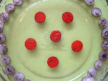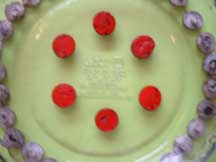 Fig. 4.- Seis imanes flotando se acomodan en un pentágono centrado en equilibrio. Cambiar la configuración requiere una energía de activaciónEn el caso de 6 imanes flotando, las figuras posibles son dos: el pentágono centrado, Fig. 4 y el hexágono Fig. 5. Moviendo el imán externo con cierto cuidado puede observarse la existencia de una energía de activación diferente para pasar de una a otra configuración. Se puede enfocar la atención con preguntas como: ¿Observas que los imanes perturbados regresan a figuras simétricas?