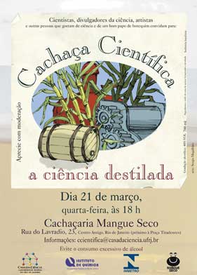 Neste evento, o tema é a cachaça em seus vários aspectos: história da cachaça; seus procedimentos de fabricação e certificação; os princípios científicos básicos que estão por trás do processo de fermentação, o aroma e o gosto; a produção da cana-de-açúcar no Brasil; o efeito do álcool no corpo; a cachaça na literatura, entre outros temas. É a ciência na dose certa!As vagas são limitadas. Chegue cedo para garantir seu lugar! Não há sistema de reserva antecipada.