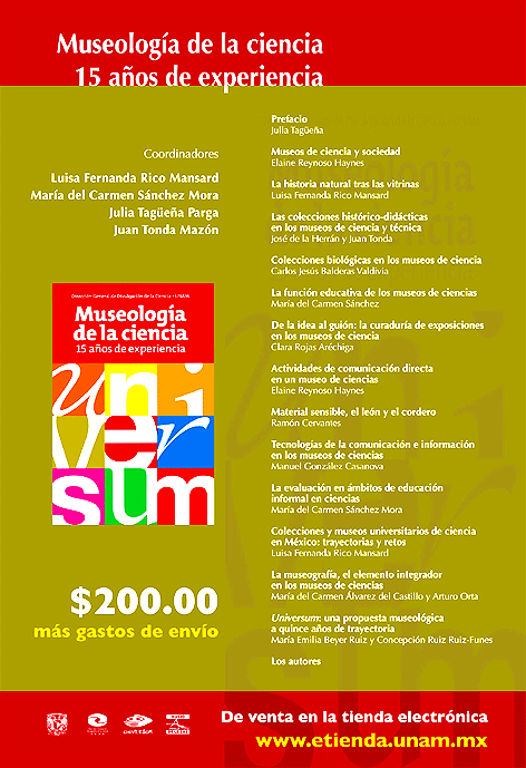 Libro editado por la Dirección General de Divulgación de la Ciencia a propósito del 15° Aniversario del Museo Universum, el museo de Ciencias de la UNAM, en el que se reúnen algunas reflexiones en torno al complejo tema de los museos como aporte para una plataforma conceptual que sustente y optimice el desarrollo de actividades museológicas y museográficas relacionadas con la ciencia.