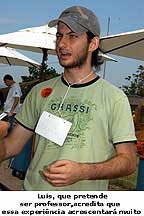 Luis Francisco Bianchessi, aluno do primeiro ano do curso de Química, participa do treinamento e revelou que o fato da Oficina Desafio ter ido à sua escola quando ainda cursava o segundo ano do ensino médio foi fundamental para sua decisão. ?Quando vi o cartaz anunciando o processo seletivo resolvi preencher a ficha e participar?, disse Luis. Ele lembra que as atividades propostas e o ambiente entre os monitores que estiveram na sua escola chamaram muito a sua atenção. ?Queria fazer parte desse projeto. Imagino que não exista uma rotina e como pretendo ser professor isso certamente acrescentará bastante na minha formação?, concluiu ele. |